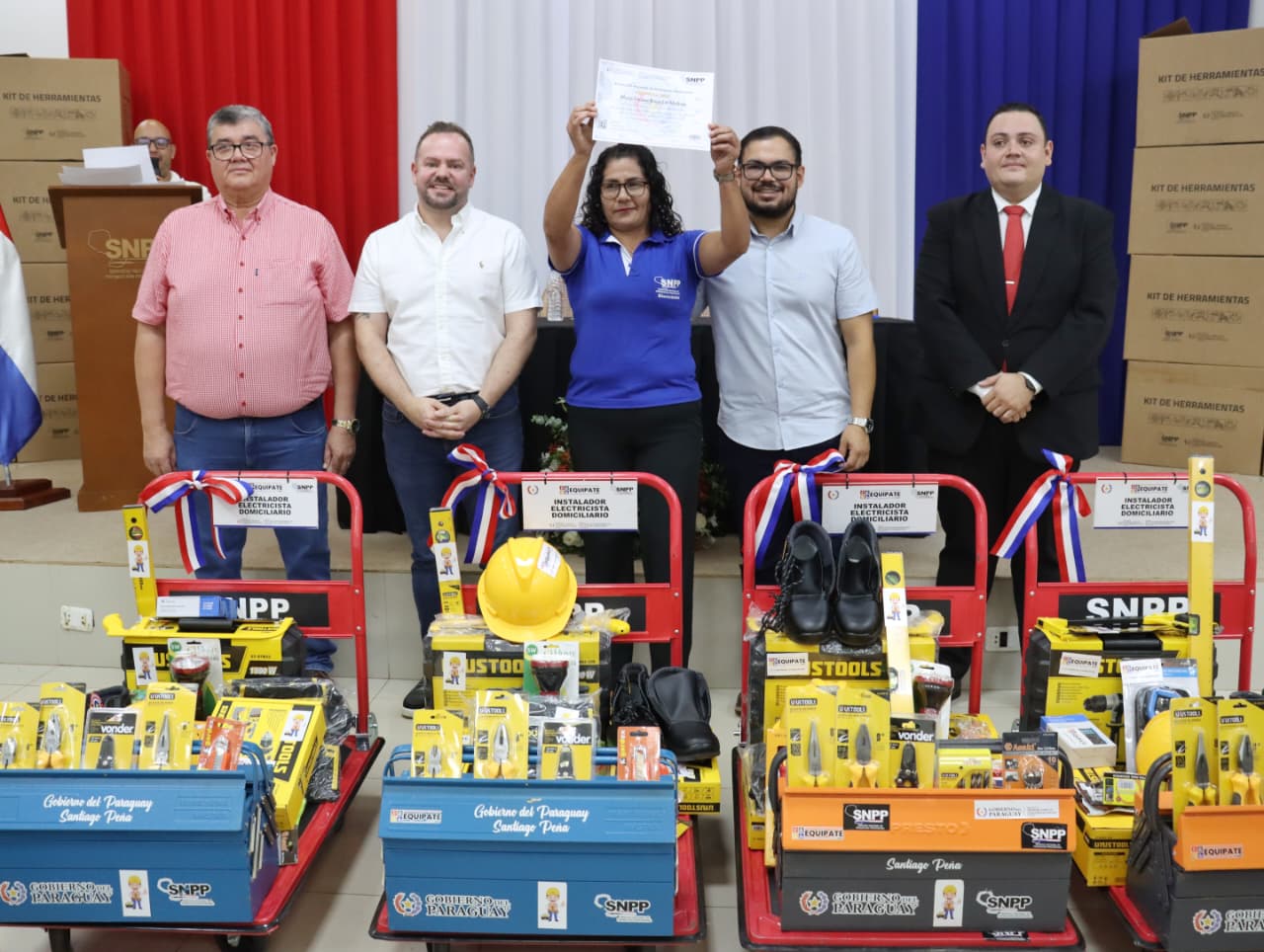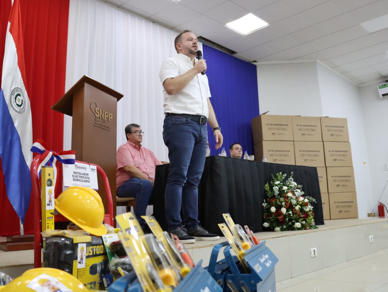 Durante la actividad, 32 egresados del curso de Instalación Eléctrica Domiciliaria, desarrollado en el SNPP Regional Amambay, recibieron sus certificados y lotes de herramientas en el marco del Programa EQUIPATE. Estos recursos constituyen un apoyo fundamental para que los participantes puedan iniciar su actividad laboral, fomentar el autoempleo y acceder a oportunidades dentro del sector técnico.