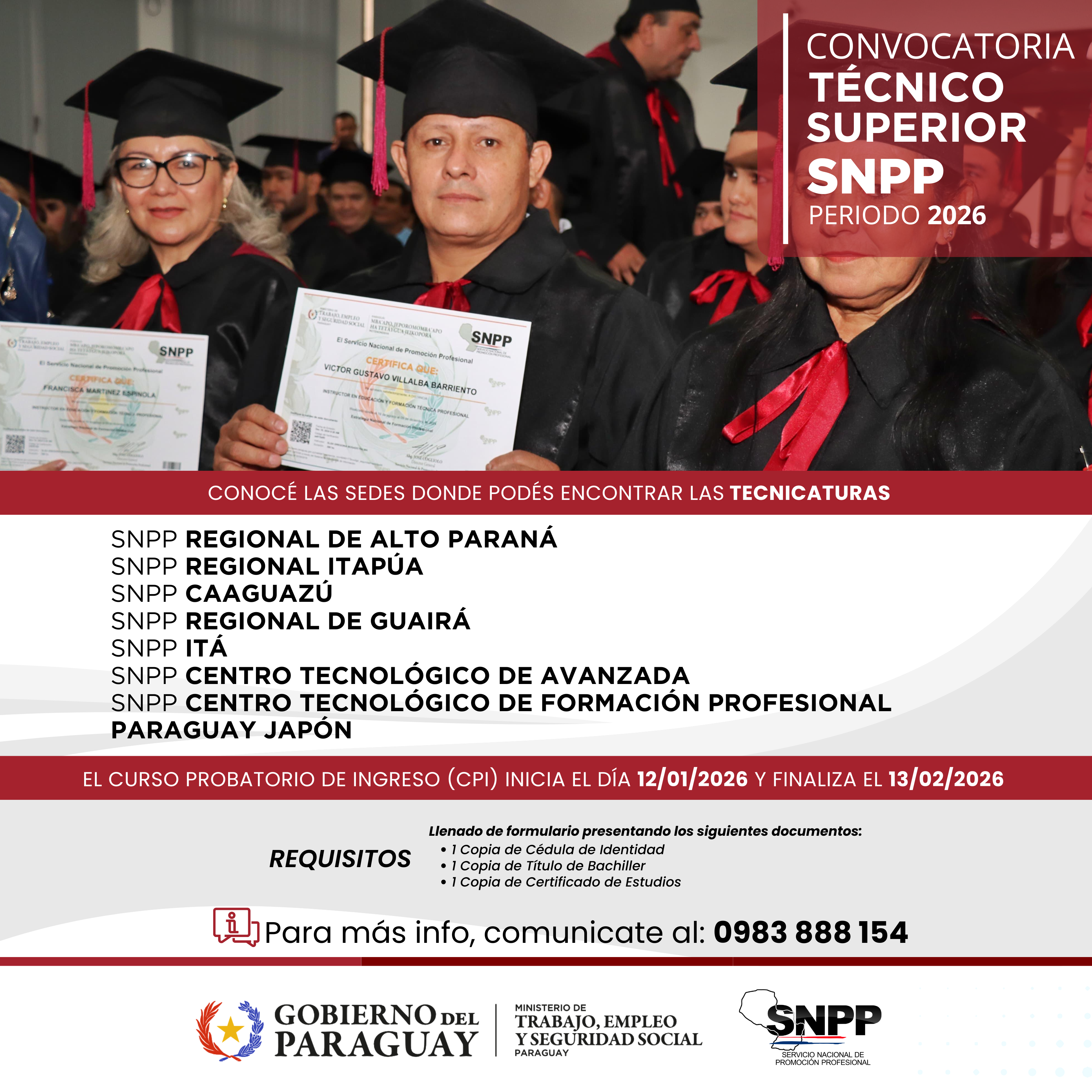 El Servicio Nacional de Promoción Profesional (SNPP) anuncia la apertura del periodo de inscripciones para el Curso Probatorio de Ingreso (CPI) correspondiente a la oferta de Programas Técnicos Superiores 2026. Las formaciones abarcan áreas como Mecatrónica, Electricidad Industrial, Electrónica Industrial, Gestión de Planta Industrial, Tic, Robótica, Administración, Mecánica Automotriz, Refrigeración, Diseño de Moda, entre otras. Estas acciones se ofrecerán en los departamentos de: Central, Alto Paraná, Caaguazú, Guairá e Itapúa reafirmando su compromiso con la formación de profesionales altamente capacitados y con las demandas actuales del sector productivo nacional.