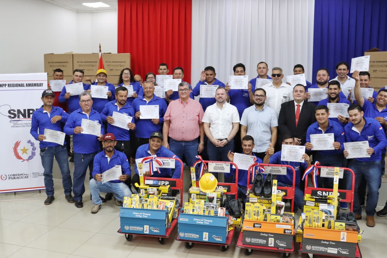 En una jornada orientada a fortalecer la formación técnica y la inserción laboral de los participantes en el departamento de Amambay, se llevó a cabo el acto de entrega de herramientas del Programa EQUIPATE y la habilitación de nuevos equipos Informáticos. El evento contó con la presencia del Director General del SNPP, José Cogliolo, acompañado del Director Regional de Amambay, Ismael Benítez, instructores y egresados.