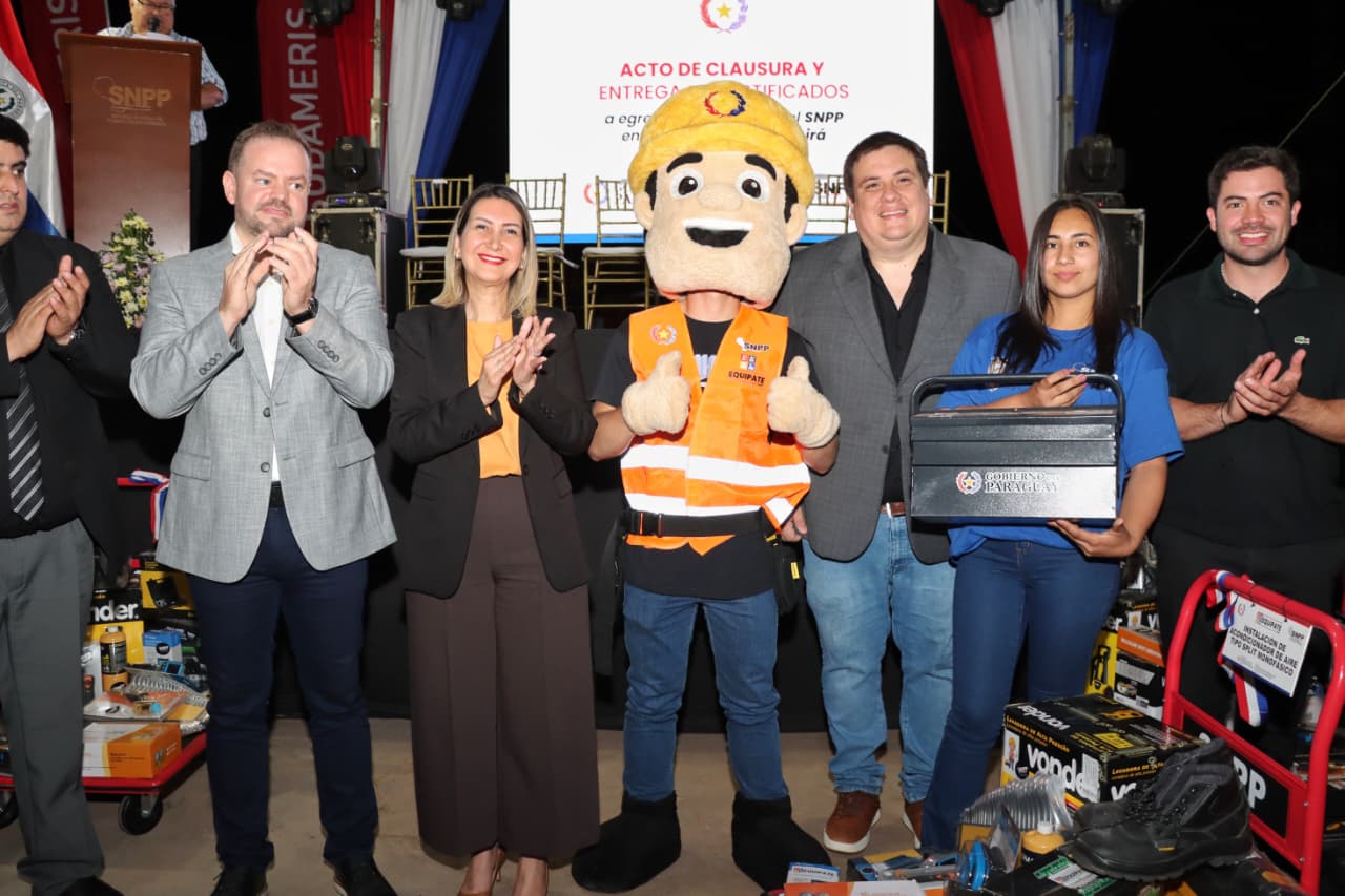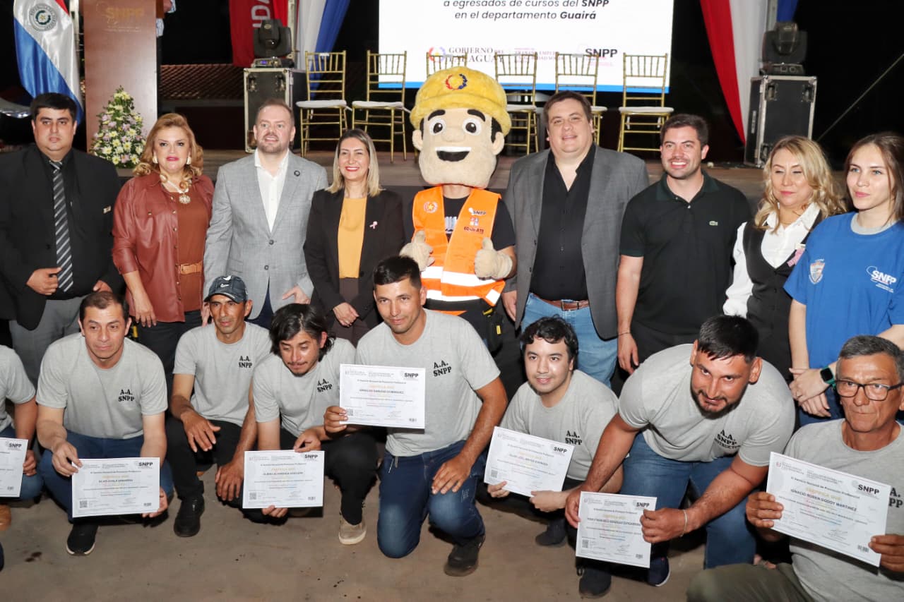 El evento contó con la presencia de la Ministra de Trabajo, Empleo y Seguridad Social (MTESS), Mónica Recalde; el Director General del SNPP, José Cogliolo; el Gobernador de Guairá, César Sosa y directores de las sedes, quienes entregaron los certificados a los egresados formados en las siguientes especialidades: