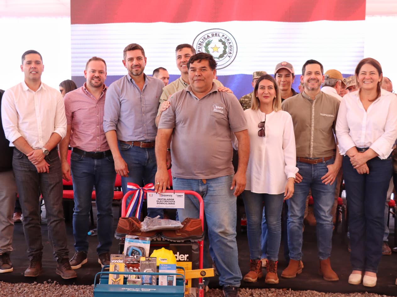 En el marco del Día de Gobierno en el Departamento de Canindeyú, el Gobierno del Paraguay, encabezado por el Presidente de la República, Santiago Peña, junto al Vicepresidente de la República, Pedro Alliana; la Ministra de Trabajo, Empleo y Seguridad Social, Mónica Recalde; el Director General del SNPP, José Cogliolo y autoridades nacionales, hicieron entregas de herramientas del Programa EQUÍPATE, llevada a cabo a través del Servicio Nacional de Promoción Profesional (SNPP).