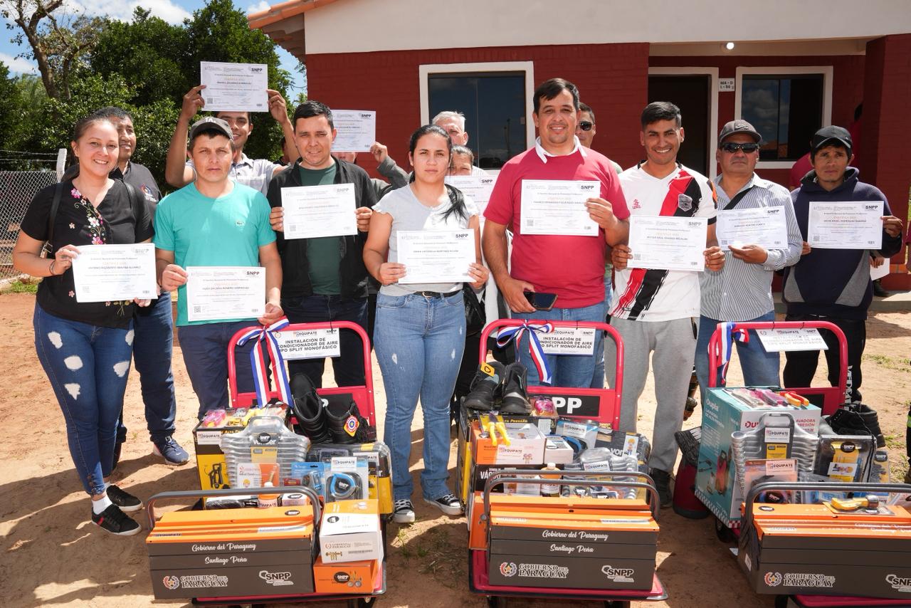 En el marco del Día de Gobierno en el Departamento de Misiones, el Gobierno del Paraguay, el Presidente de la República, Santiago Peña, acompañado por el Vicepresidente de la República, encabezaron una jornada de desarrollo y oportunidades para los pobladores de la zona, destacando la entrega de certificados y herramientas del Programa EQUIPATE a egresados de cursos de diversas áreas. Una iniciativa estratégica llevada a cabo a través del Servicio Nacional de Promoción Profesional (SNPP), dependiente del Ministerio de Trabajo, Empleo y Seguridad Social (MTESS), cuyo objetivo es dotar a los egresados de los cursos del SNPP de herramientas y equipamientos que les permitan incorporarse al mercado laboral formal o iniciar sus propios emprendimientos productivos.