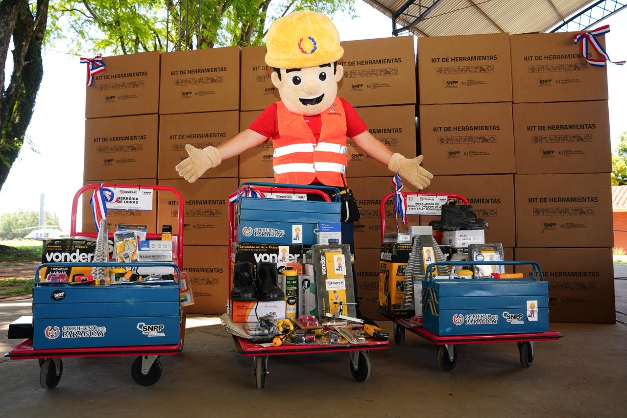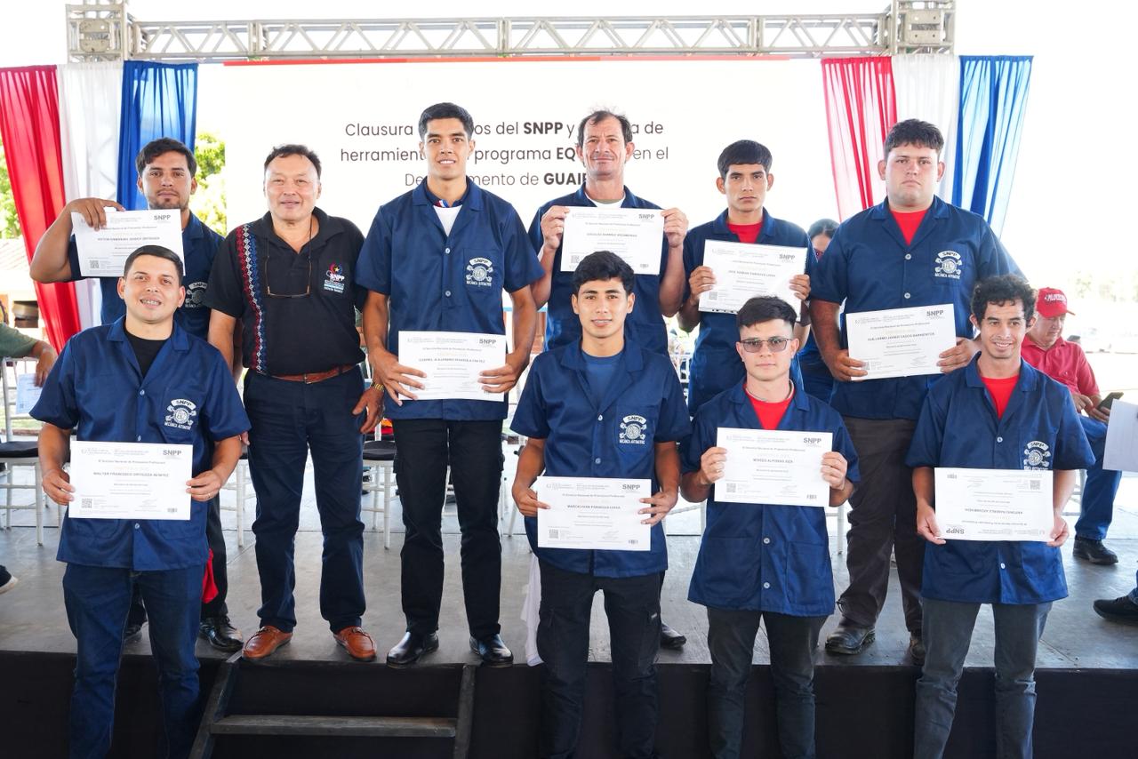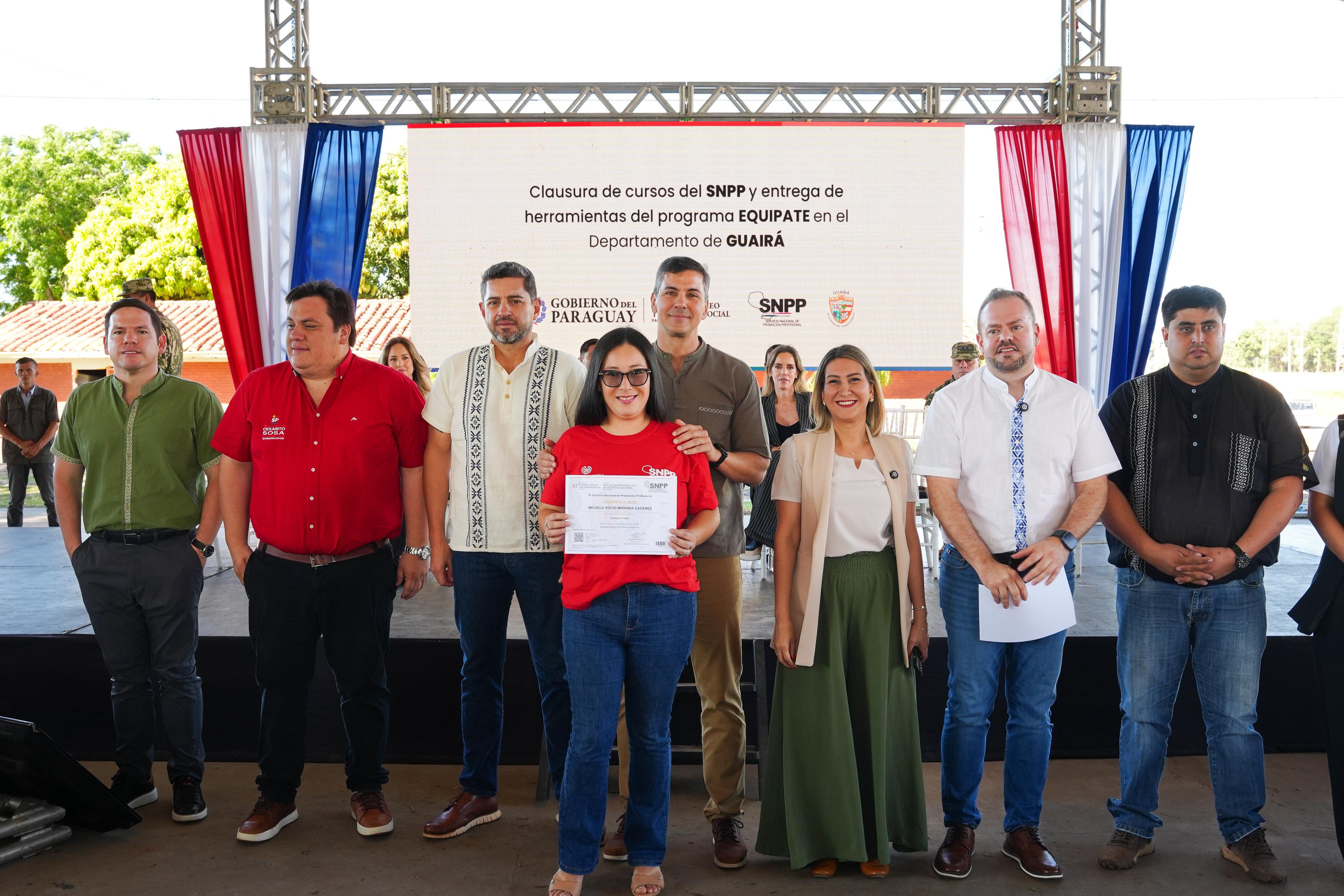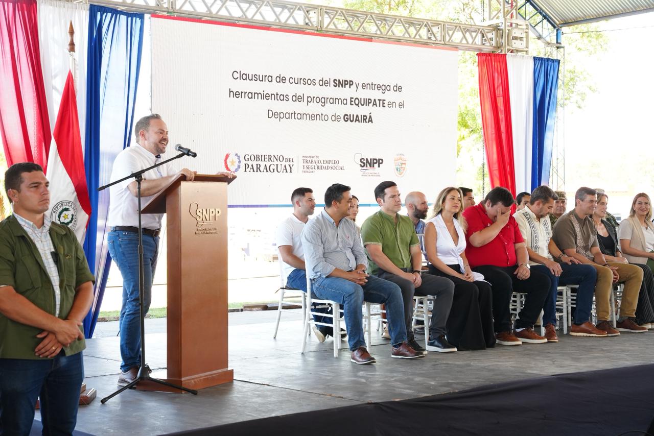 La jornada contó con la presencia de la Ministra de Trabajo, Empleo y Seguridad Social, Mónica Recalde; el Gobernador del Departamento de Guairá, César Sosa; y el Director General del SNPP, José Cogliolo, quienes acompañaron la entrega de herramientas y equipamientos del Programa Equipate, destinados a egresados de cursos técnicos en las áreas de Electricidad, Refrigeración y Metalmecánica, desarrollados en el IV departamento.
