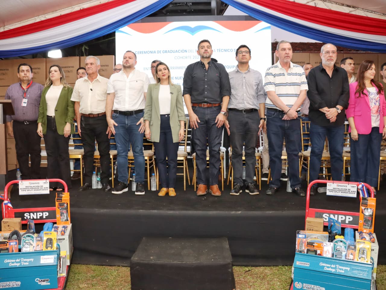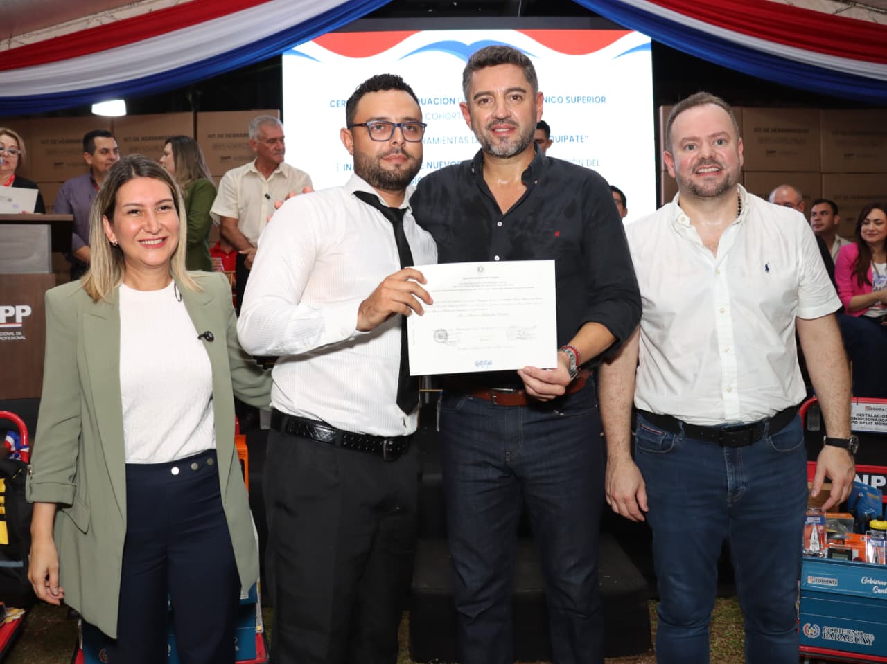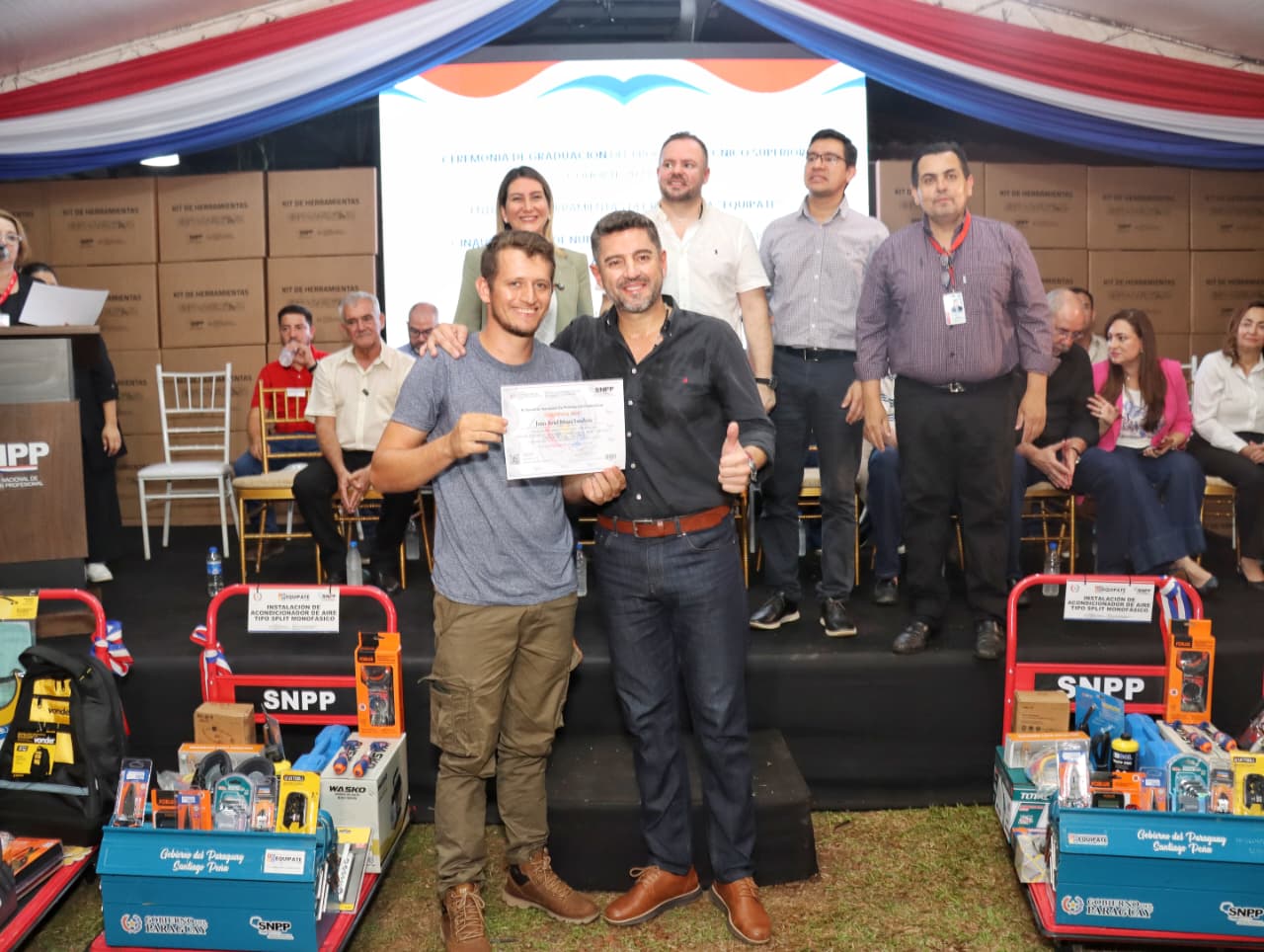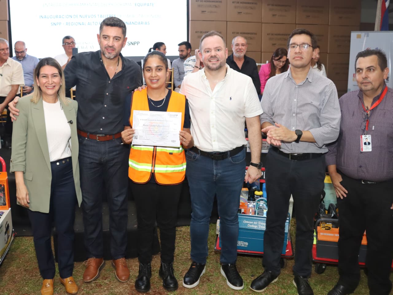 Como parte central de la jornada, se realizó la entrega de 122 lotes de herramientas a egresados de diferentes especialidades, en el marco del Programa “Equipate”, una iniciativa del Gobierno del Paraguay, orientada a facilitar la inserción laboral y el impulso al autoempleo.